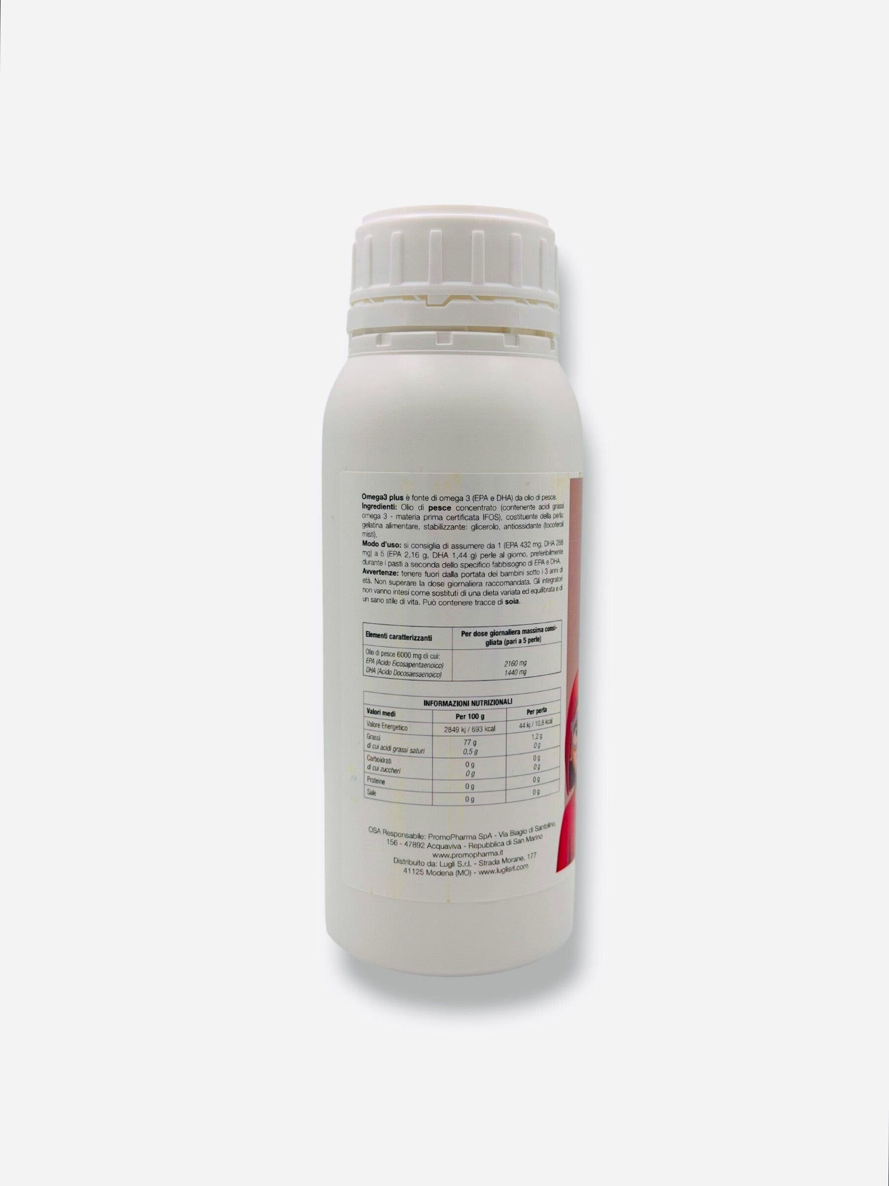 Ingredienti: Olio di pesce concentrato (contenente acidi grassi omega 3 - materia prima certificata IFOS), costituente della perla: gelatina alimentare, stabilizzante: glicerolo, antiossidante (tocoferoli misti)