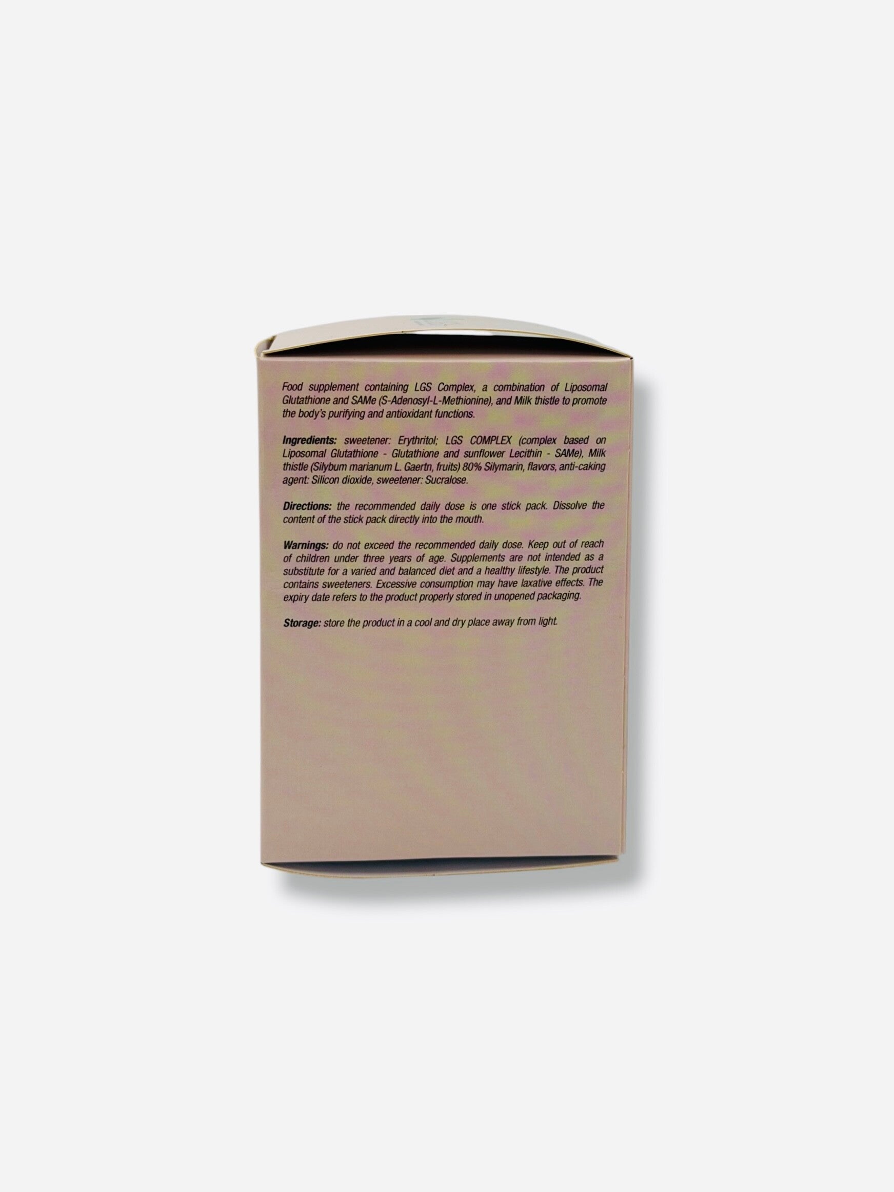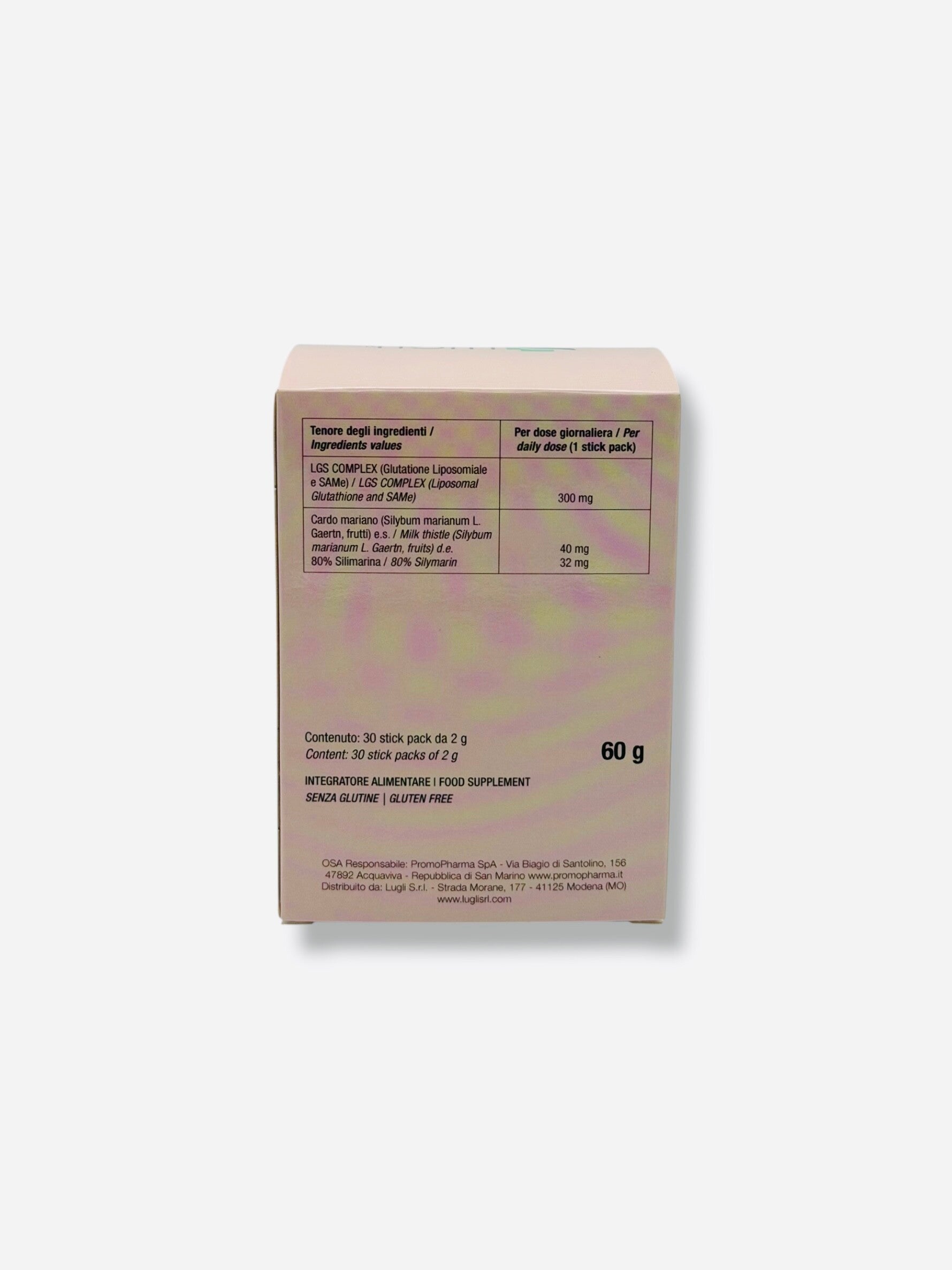 Ingredienti: edulcorante: eritritolo; LGS COMPLEX (complesso a base di Glutatione liposomiale - Glutatione e Lecitina di girasole - SAMe) Cardo mariano (Silybum marianum L. Gaertn, frutti) 80% Silimarina, aromi, antiagglomerante: biossido di silicio, edulcorante: sucralosio.